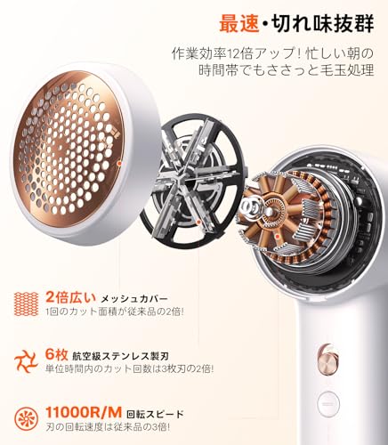 2000mAhのリチウムバッテリーを内蔵し、満充電の状態で最大180分の連続使用が可能。スタイリッシュな外観で毛玉取り器に見えないおしゃれさが特徴です。