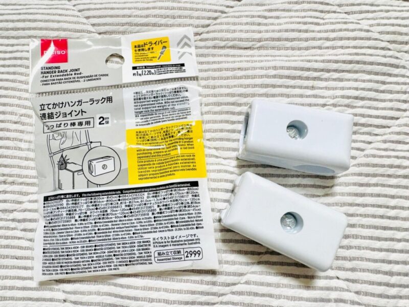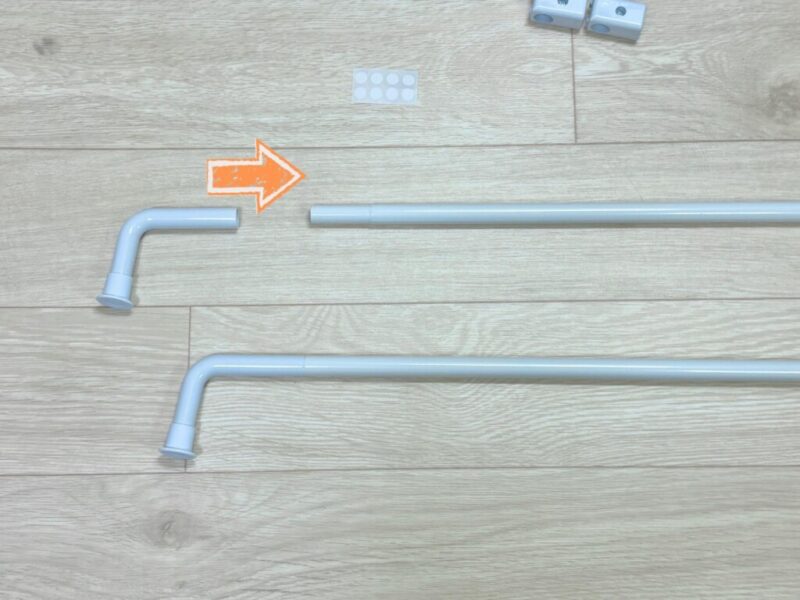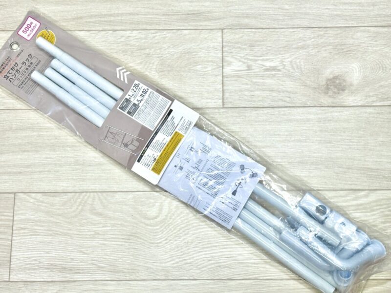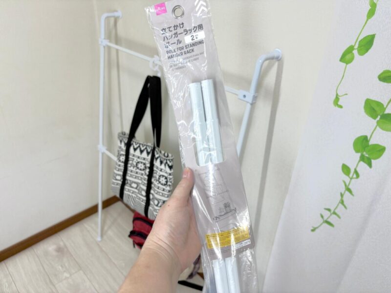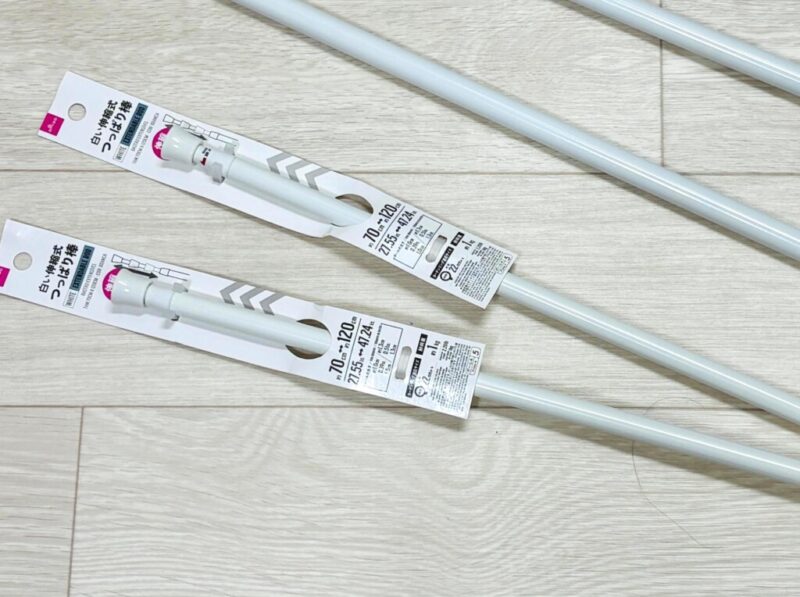 絶対に必要なのが突っ張り棒。セットに含まれているのは縦の支柱部分のみ。横に渡すポールは、自宅のスペースに合わせたサイズの突っ張り棒(直径1〜1.3cm対応)を自分で選んで組み合わせるスタイルなんです。