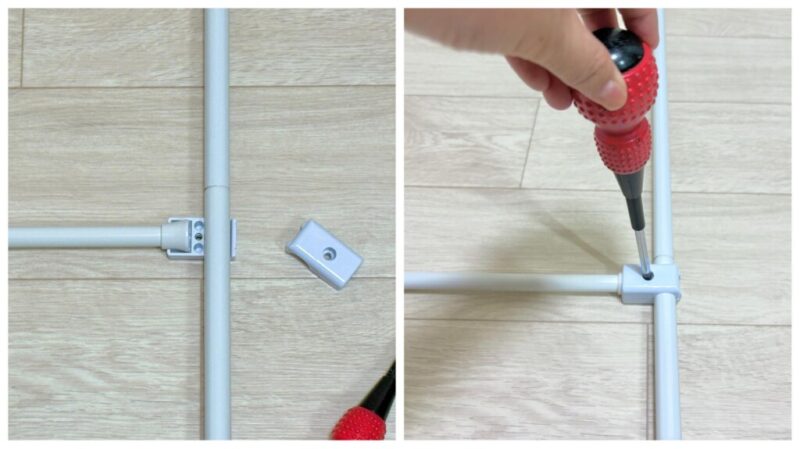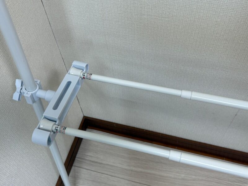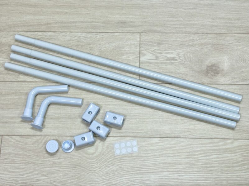 組み立てはとてもシンプル。2本のポールを繋いで支柱を作り、連結ジョイントで突っ張り棒を固定するだけです。固定する高さを自由に決められるのが嬉しいポイントですね。