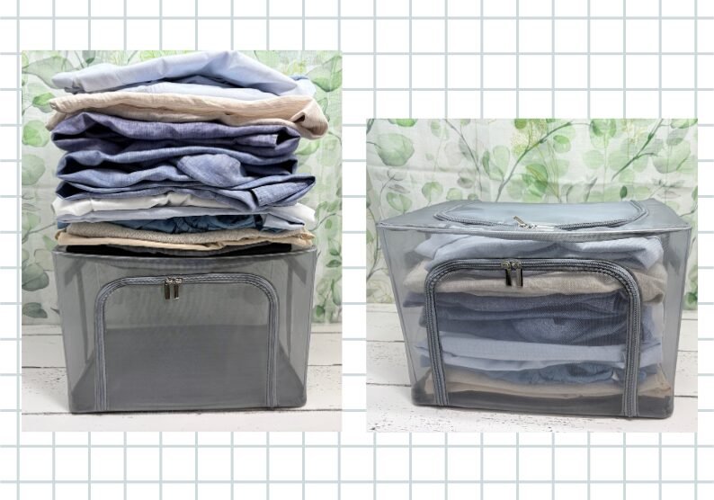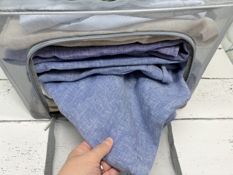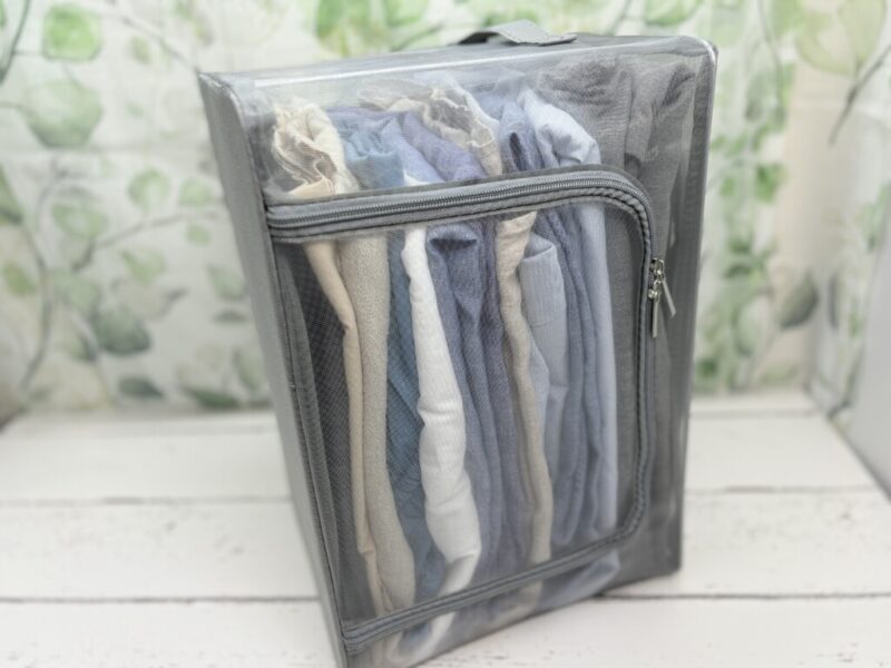 夏物衣類なら、ふんわり入れて12枚。ぎゅっと詰めれば18枚ほど入ります。メッシュ素材で中身がパッと確認できるのも、探す手間が省けて助かりますね。
