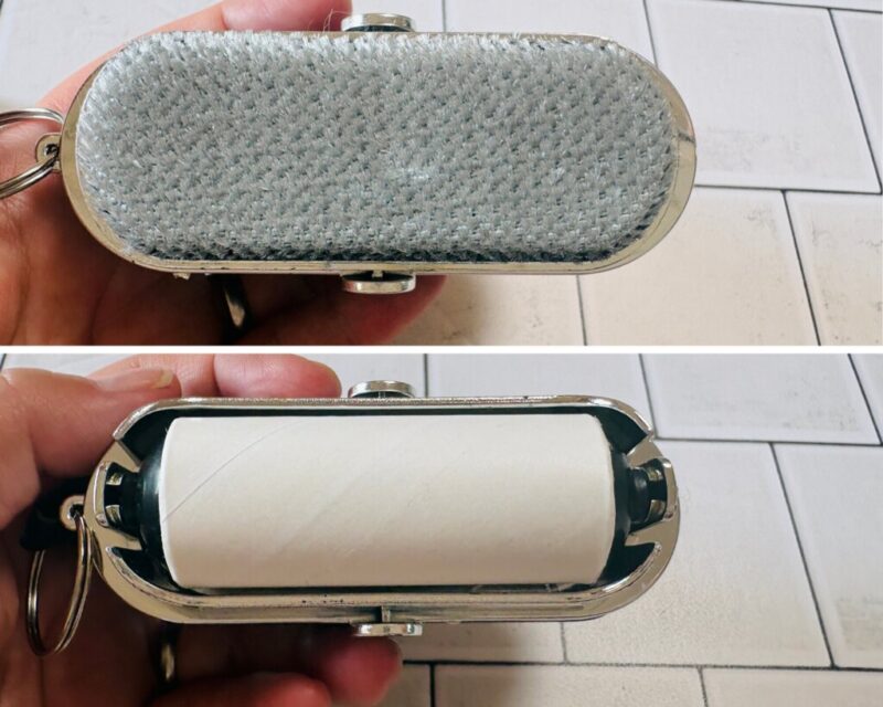 本体下部のケースを外すと、ミニサイズの粘着ローラーが現れます。 こちらはポリエステルやアクリルニットなどの丈夫な素材に向いています。