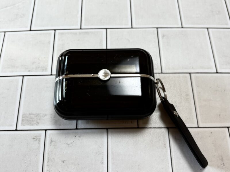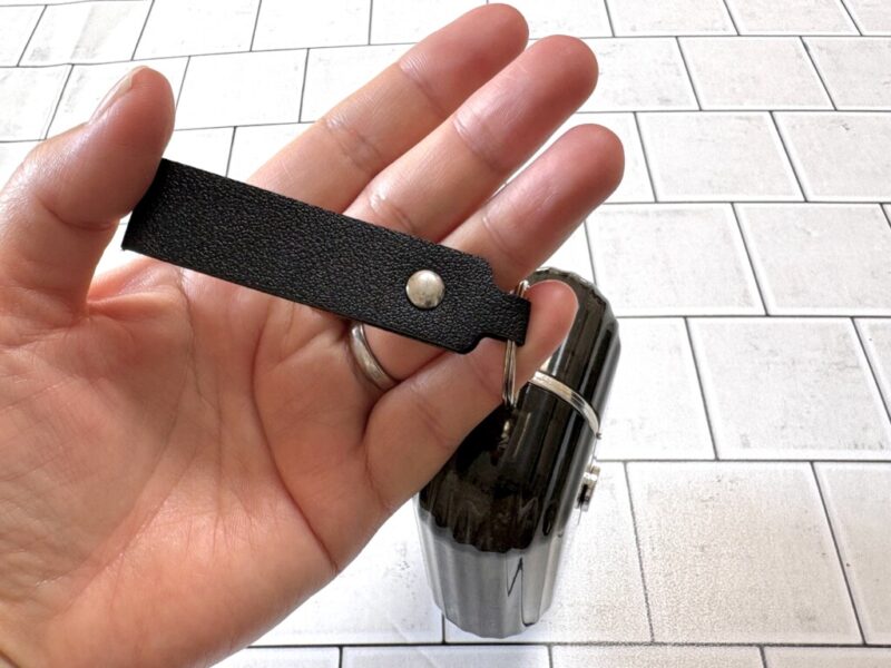 レザー風ストラップが付いていて、バッグの持ち手にぶら下げておいても生活感が出すぎません。