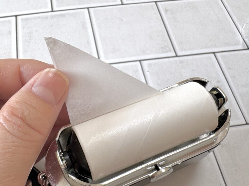 しかし、この商品は角を少しつまむだけで、スルスルと新しい面が出てきます。急いでいる時でもストレスフリー。ロールの全長は約2.1mあり、携帯用としては十分なボリュームです。