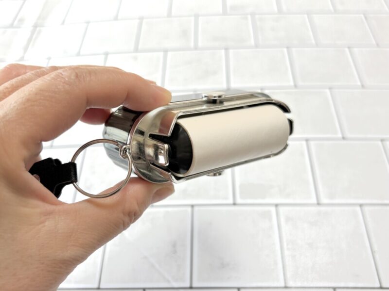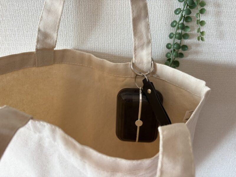 私はバッグの内側にセットして愛用しています。サイズも手のひらに収まるコンパクトさで、ミニバッグ派の方でも邪魔にならないでしょう。