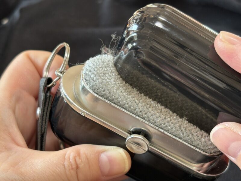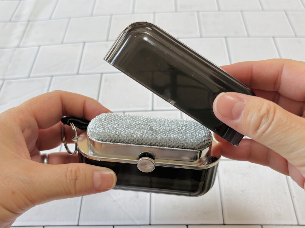 本体のキャップをパカッと開けると現れるのがエチケットブラシ面です。 ウールのスーツやコート、カシミヤのマフラーなど、デリケートな天然素材にはエチケットブラシ面を使います。
